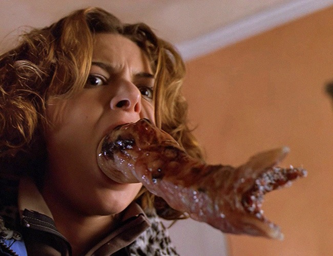 Poor Kari Wuhrer is dragged around in a bathrobe trying to seduce any and everything because she had the misfortune of being struck by a flying pancake—hey, that's what they look like. Trouble is, Maggie is still 100% human. She may have a parasite life form controlling her, but it wouldn't give her Spider-Man's abilities. If her human body fell four stories, she should still break her legs. Probably even die. Not Maggie though. She's suddenly bullet proof. Let's hear it for symbiosis.