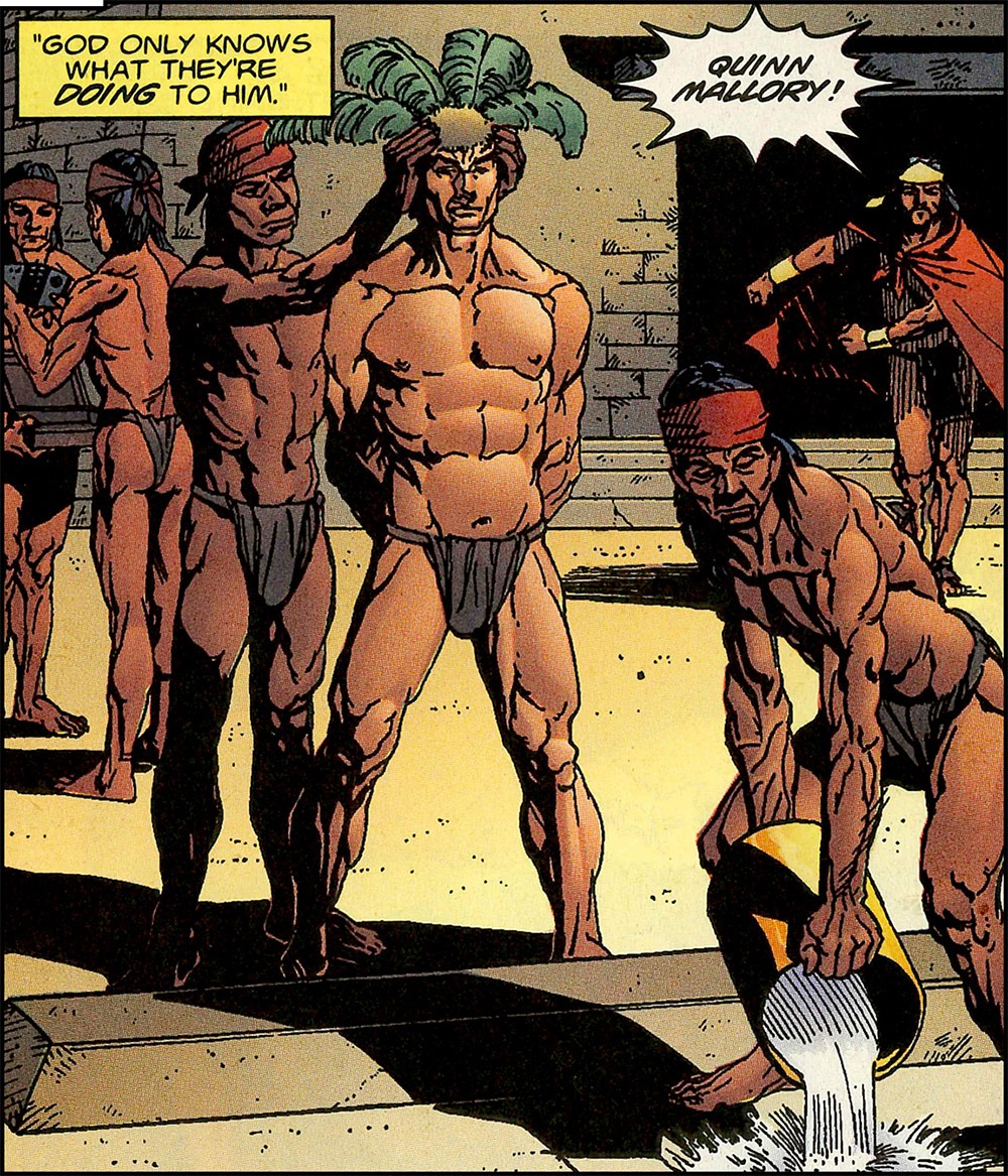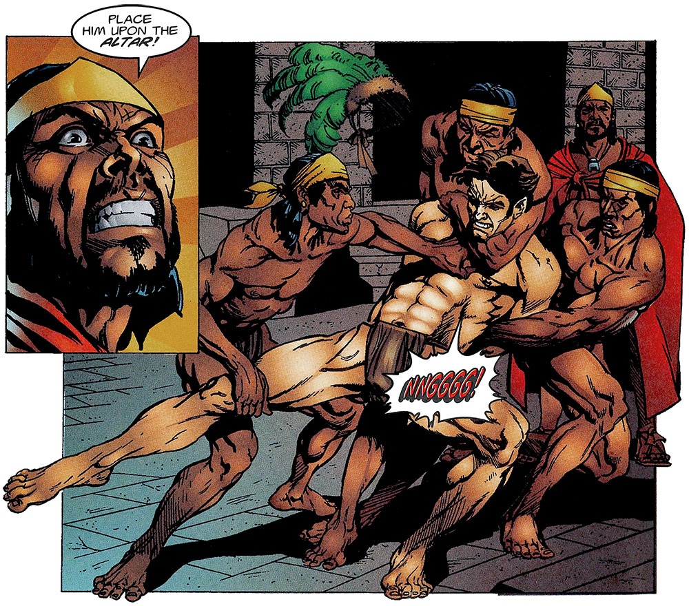 Okay, what? We’re like 8 pages in and I have no idea what’s going on. Anyways, they’re ‘caught’ (or whatever) by these “Aztecs,” and they’re like “Oh yeah let’s just talk in English in their faces because they are so dumb obvz becuz they’re all wearing loincloths.” Actually, no joke, the Professor just calls them “SAVAGES.”