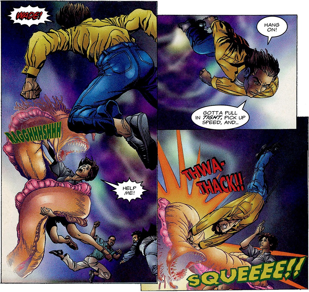 What is a biggie is the fact that while they’re in the vortex the re-enact that one episode of Star Trek: The Next Generation where Barclay sees magic worms in the transporter beam. One of them grabs Wade, which prompts Quinn to “pull in tight,” and more or less drop kick a motherfuckin’ worm in the motherfuckin’ vortex.
