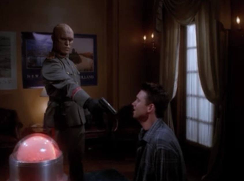 Yes, I guess it’s still based in the sci-fi conceit of the show, but we’re basing it on human concerns. It’s an amazing teaser, unlike so much that’s come before. Doubles, so often on this show, are forces of evil. Either forces of evil, or just forces of darkness. I think the only time we’ve met a double who wasn’t downright evil was Wade’s double in “Double Cross,” and she was willing to (probably) take money to impersonate someone in order to get the team in danger (Colin’s double in “Lipschitz Live” doesn’t count, he’s too stupid). Doubles of people the team knows fare better—but the only case of that is really Daelin Richards. Remember Colin’s ‘girlfriend’ in “O Brother, Where Art Thou?” Also pretty much evil.