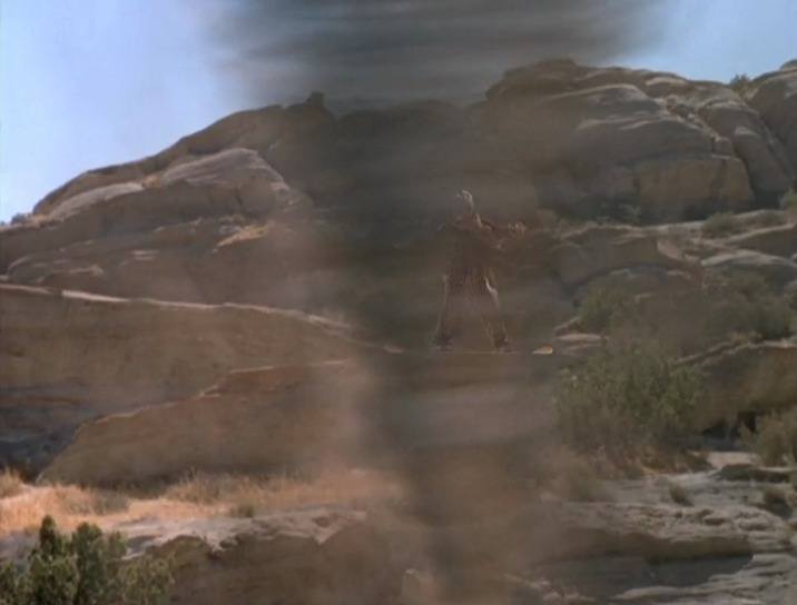 And the thing is, at the end of this season, we’ll come to the point where the majority of episodes are like this, not like Season One. The vast majority of Sliders is an action-adventure show steeped in 90s signifiers. So the argument of “Sliders shouldn’t have a kid skateboarding a tornado” doesn’t really hold water. Of course he’s shredding a twister! It’s 1996! The real criticism should be that he’s shredding it too late in the 90s for the joke—the moment is more Capri-Sun than %100.