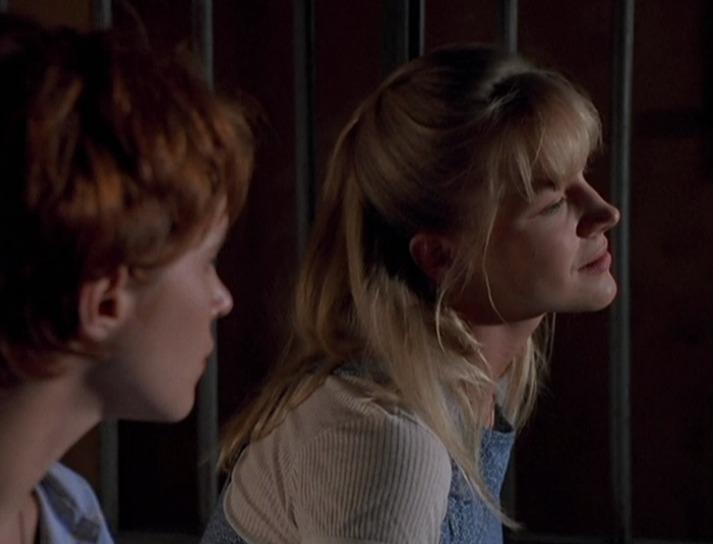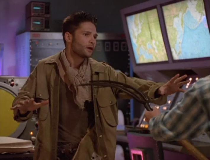And even without all that, I was pretty engaged by the whole “dictator under the guise of good” village plot. I mean, sure it’s done to death, but never before on Sliders, and it wasn’t just tacked on to the more interesting ‘twister’ plot. The story, for all its strange difficulties, is actually pretty well put together. It’s not an obvious thing that the leader of the village would be partially responsible for the twisters. The fact that Corey Feldman is his son is a little more obvious. But still—there are sort of a lot of ‘new’ characters running around, and they all get something to do, a little moment to shine here and there.