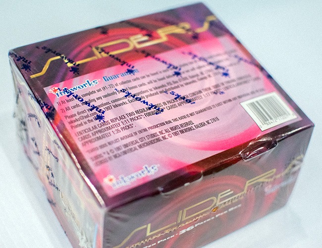 As you can see from the promotional advertisement, each complete deck consists of 72 base cards, with nine “special” cards from season 3, six foilwork Kromagg cards, and two lenticular cards packed into each box as rare finds. The base deck does include exclusives like Alternate Worlds artwork based on parallel worlds visited in the show and Sliders comics cover art for every issue save “Deadly Secrets.” The rest of the set includes production stills from various episodes, and while many of the photos don’t correspond with the episode they reference on the back, there are some cool shots you likely won’t find elsewhere, particularly the ones of the Kromaggs from “Invasion.”